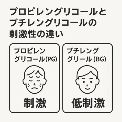 | 刺激性 | 人によって刺激やアレルギーが出やすい(比較的高い) | PGより低刺激 |